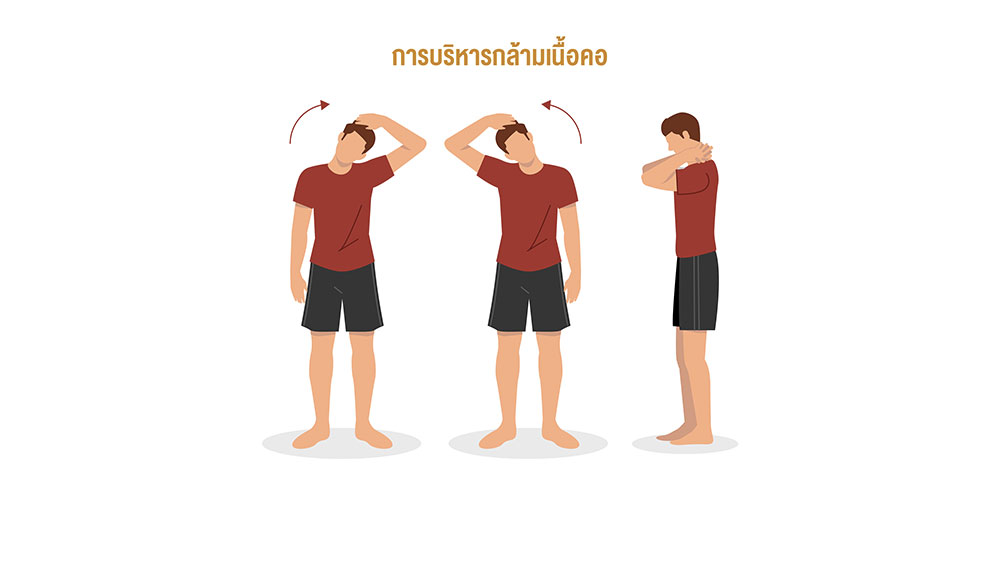 1. การบริหารกล้ามเนื้อคอ เริ่มจากนำมือข้างซ้ายอ้อมไปจับศีรษะด้านขวา ดึงมาทางด้านซ้ายจนรู้สึกตึง นับ 1-10 สลับใช้มือข้างขวา นับ 1-10 เช่นเดียวกัน จากนั้นประสานมือบริเวณท้ายทอย ดันไปด้านหน้าจนรู้สึกตึง นับ 1-10