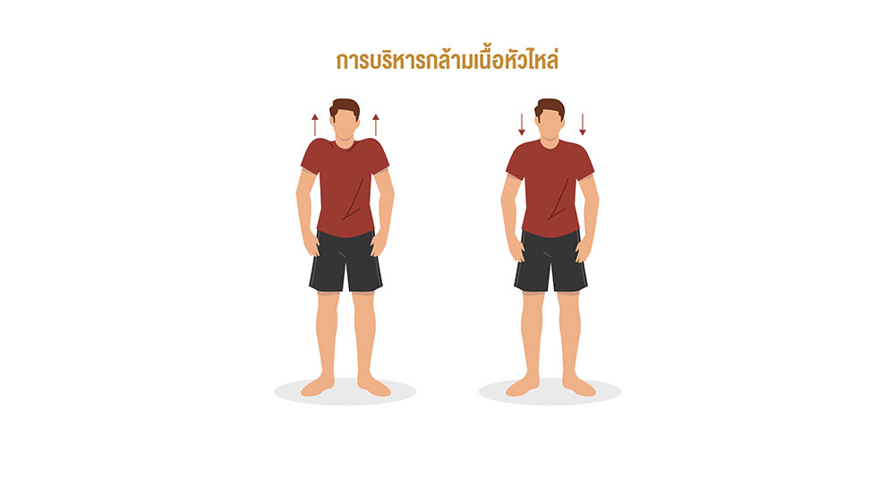 2. การบริหารกล้ามเนื้อหัวไหล่ สำหรับผู้ที่มีปัญหาเรื่องของการปวดไหล่เป็นประจำ โดยยกไหล่ขึ้นไปจนสุด แล้วเกร็งค้างไว้ นับ 1-10การกดไหล่ลงไปให้สุด แล้วเกร็งค้างไว้ นับ 1-10