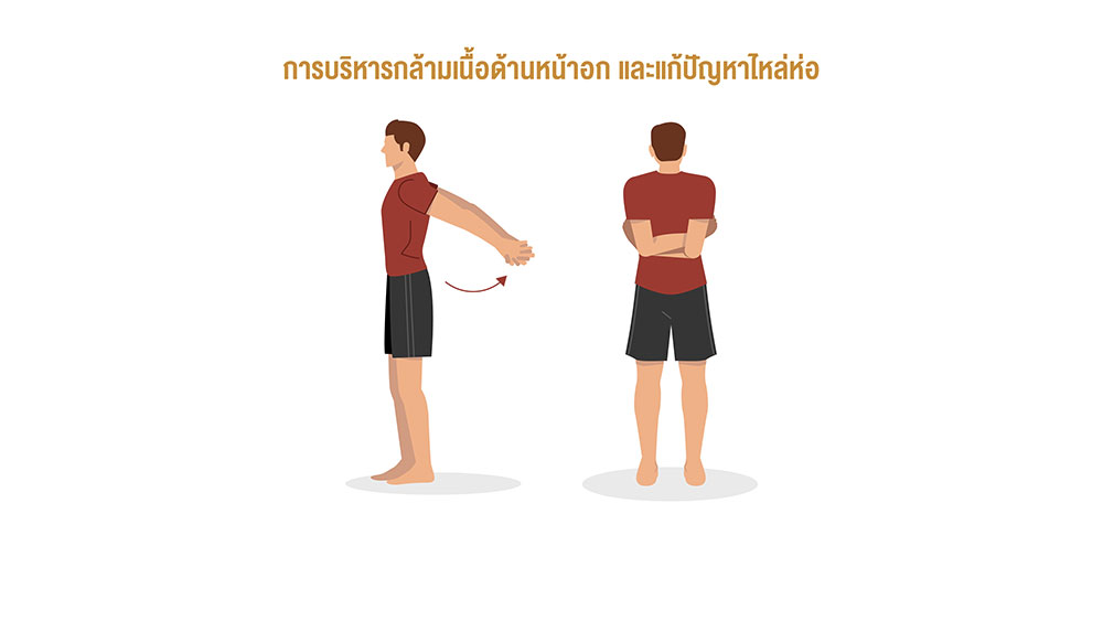 3. การบริหารกล้ามเนื้อด้านหน้าอก และแก้ปัญหาไหล่ห่อ ให้ลุกขึ้นยืน จากนั้นนำมือประสานกันด้านหลัง ค่อยๆ ยกขึ้นมาจนถึงระดับที่เรารู้สึกว่าตึง นับ 1-10 การยืดด้านหลัง โดยการกอดตัวเองให้แน่นที่สุด ให้มือไขว้กันเยอะที่สุด โดยเอามือโอบด้านหลังของตัวเองให้มากที่สุด นับ 1-10