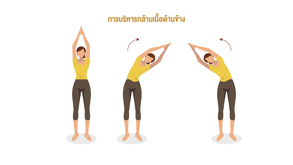 5. การบริหารกล้ามเนื้อด้านข้าง ยืดมือขึ้นบนสุดประกบกัน จากนั้นเอนตัวทางด้านซ้าย นับ 1 -10จากนั้นเอนตัวมาด้านขวา นับ 1-10 ท่าบริหารควรทำบ่อยๆ ประมาณ 1-2ชั่วโมงต่อครั้ง เพื่อเป็นการยืดกล้ามเนื้อมัดหลักๆ ในร่างกาย