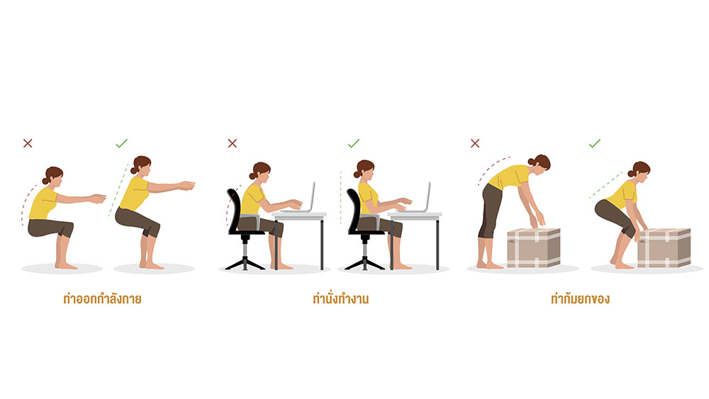 ออกกำลังกายอย่างสม่ำเสมอ/ ระวังอย่าห่อไหล่ หรือนั่งหลังค่อม/ เมื่อต้องทำงานนั่งโต๊ะเป็นเวลานานควรเดินเพื่อยืดเส้นยืดสาย/ หากต้องยกของหนักควรย่อ และยกในท่าที่ถูกต้อง